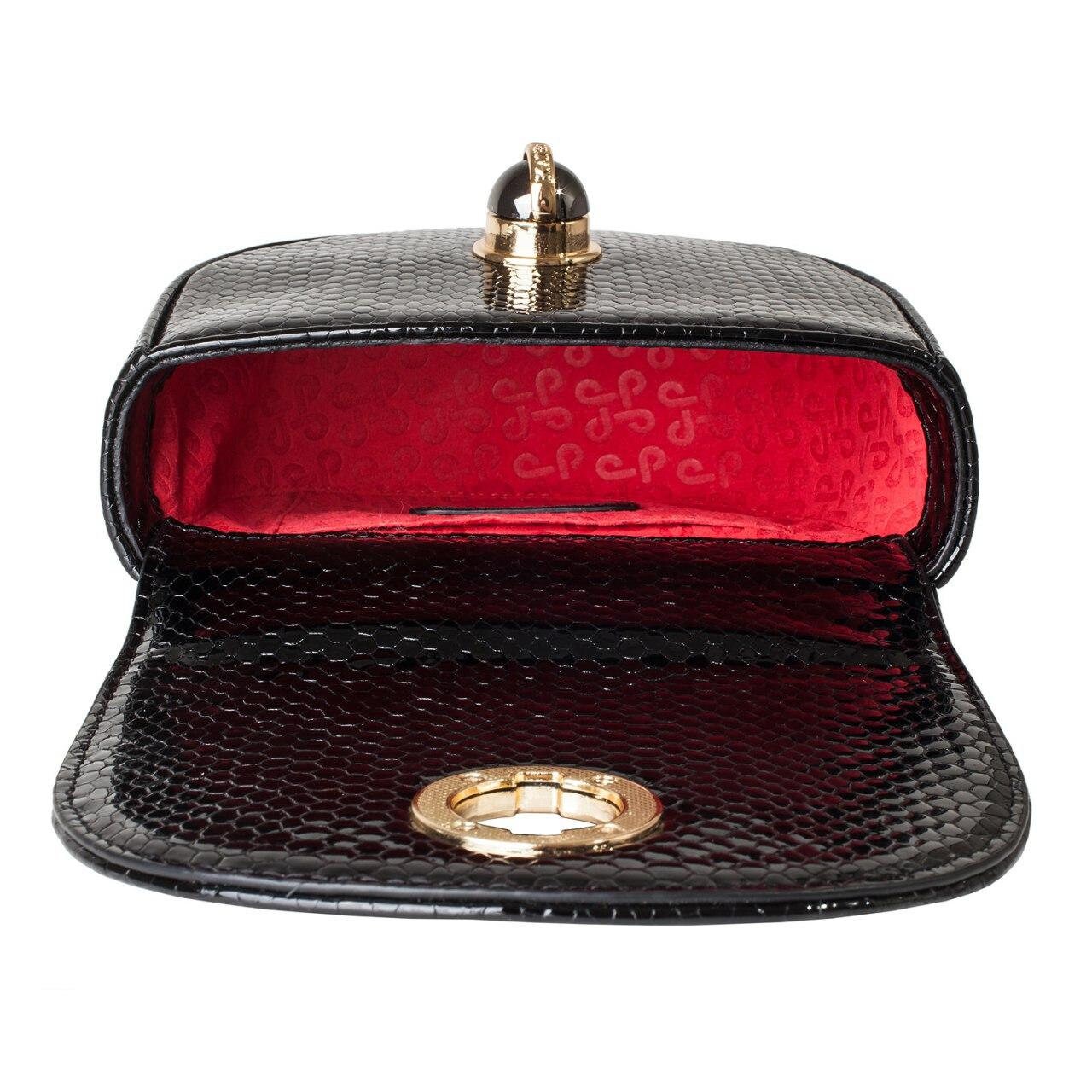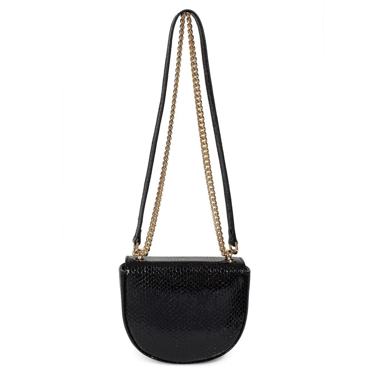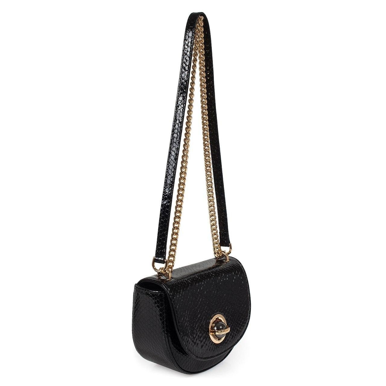 Black patent genuine leather snake print woman shoulder bag from ukrainian designer Katerina Fox. Fashionable and elegant modern bag KF for bright girls and women. This bag is able to attract attention and highlight your exquisite taste. The internal space of a bag is equipped with one spacious compartment and one patch-pocket. The bag is closed with a clasp. There is a long handle that allows you to wear the bag on the shoulder. The kit also includes a storage bag.
